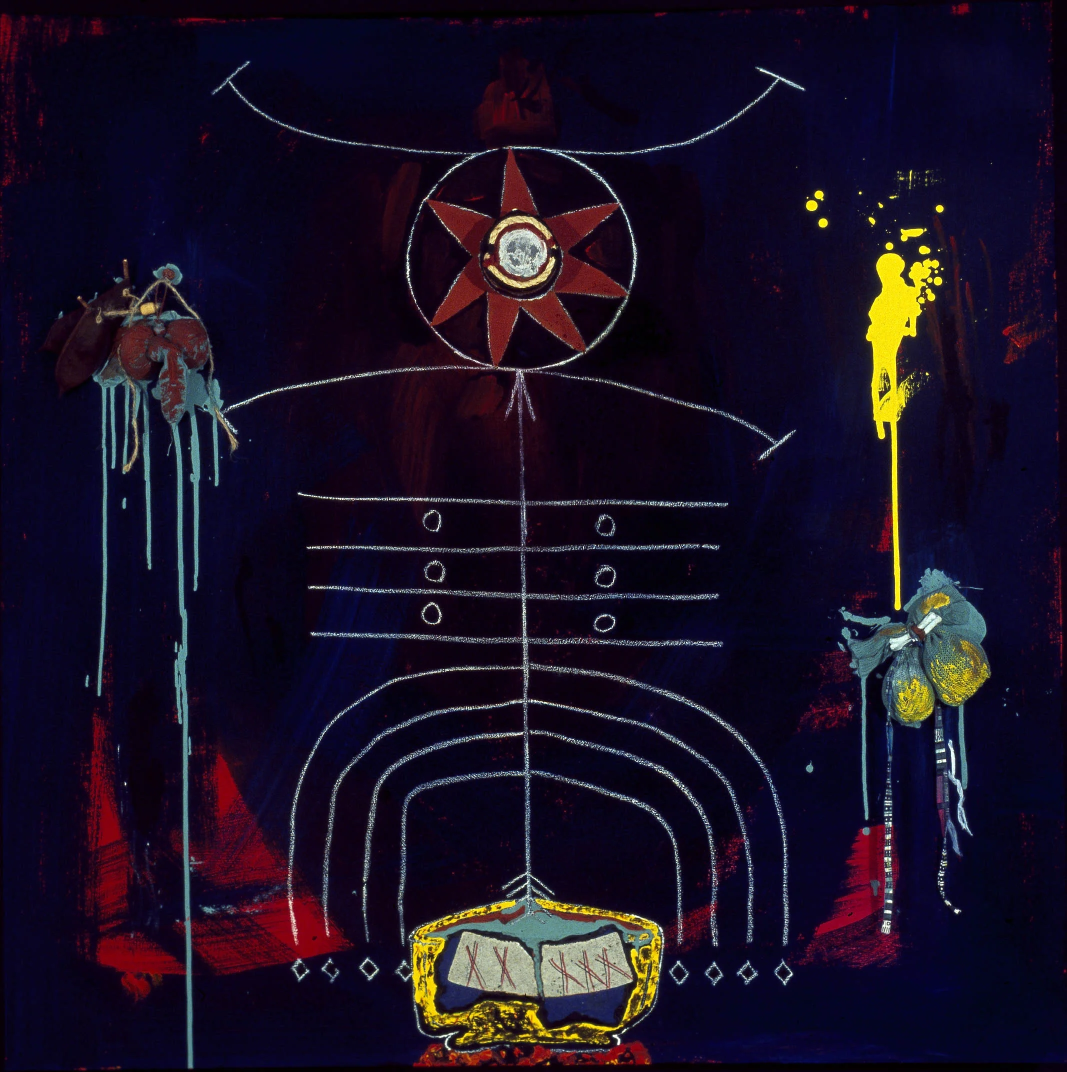 Description: acrylics, fabric, fiber, ceramics, nails, found objects on canvas and/or panels.